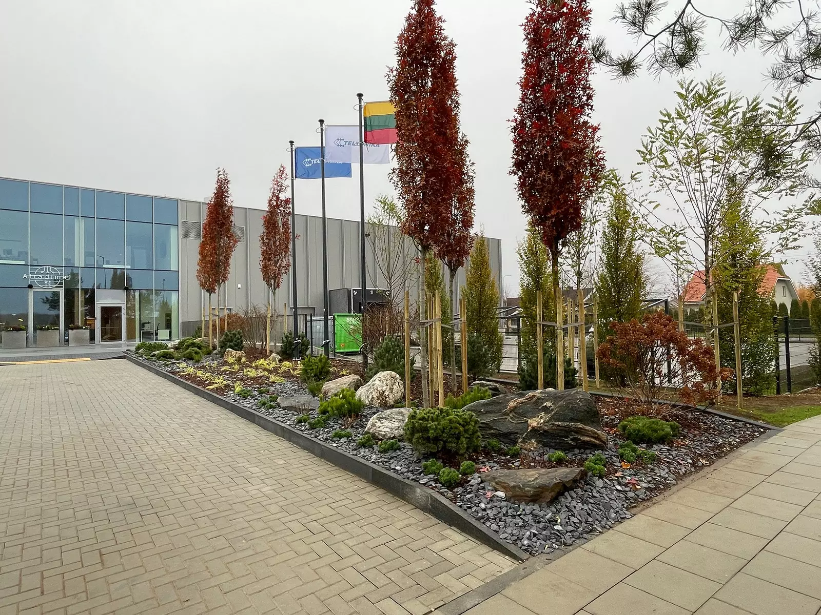 Įmonės „Gerbūvio projektai“ direktorius Antanas Magrinas pasakojo, kad svarbiausi ir didžiausi darbai technologijų centro sklype atlikti rugsėjį: aplink pastatą paklota net 9 tūkst. kv. metrų betoninių trinkelių dangų. Apie 4,5 tūkst. kv. metrų važiuojamųjų dangų ploto įrengtos sustiprintos dangos, skirtos sunkiasvorio transporto judėjimui, kita jų dalis pritaikyta važiuoti lengvajam transportui. Tiek dangos pagrindo paruošimo darbų pobūdis, tiek ir naudotų betoninių plytelių storis skyrėsi. Dalis plytelių klota mechanizuotu būdu, likusiame plote meistrai trinkeles klojo rankomis.