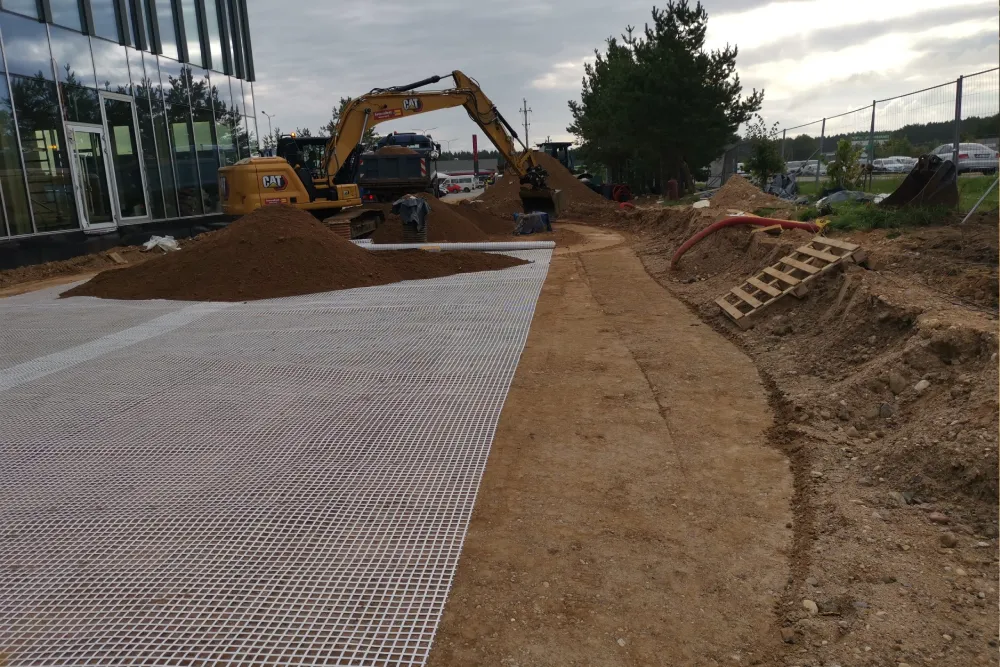 Vis tik net ir moderniausios technologijos negali pakeisti grunto sudėties: būtent ties Technologijų centru tai tapo nemenku iššūkiu – pradėjus ruoštis pagrindų trinkelių klojimui pastebėta, kad smėlio bei žvyro pagrindas praktiškai neturi molio, yra labai smėlingas. Dažniausiai žavimės smėlėtais šlaitais ir pušynais, ypač keliaudami pro Molėtus, tačiau ten, kur ateityje važinės sunkiasvoris transportas, toks gruntas nieko gera nežadėjo. Teko sukti galvą ir galiausiai pakloti specialų tinklą bei laistyti žvyrą, įvairiomis priemonėmis jį tankinti, kol pagaliau gruntas tapo pakankamai stabilus tolimesniems darbams.